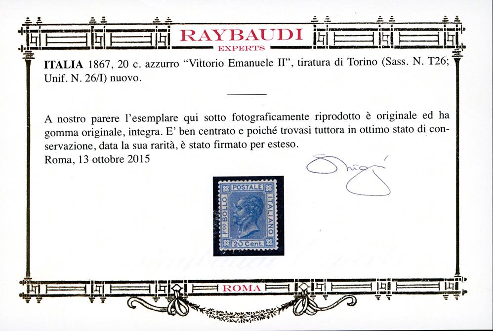 1867 - 20 cent. azzurro, tiratura di Torino (T26), ben centrato, gomma originale integra, perfetto. A.Diena, cert. Sorani e Oro Raybaudi.