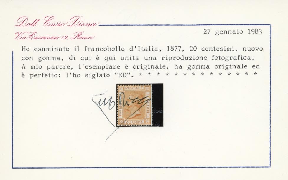 1877 - 20 cent. ocra arancio (28), discreta centratura, nuovo, gomma originale, lieve traccia di liguella, perfetto. Molto fresco. Cert. E.Diena.