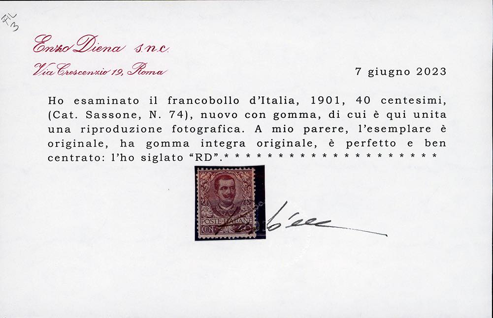 1901 - 40 cent. Floreale (74), ottima centratura, gomma originale integra, perfetto. G.Oliva, cert. Diena e Ferrario.