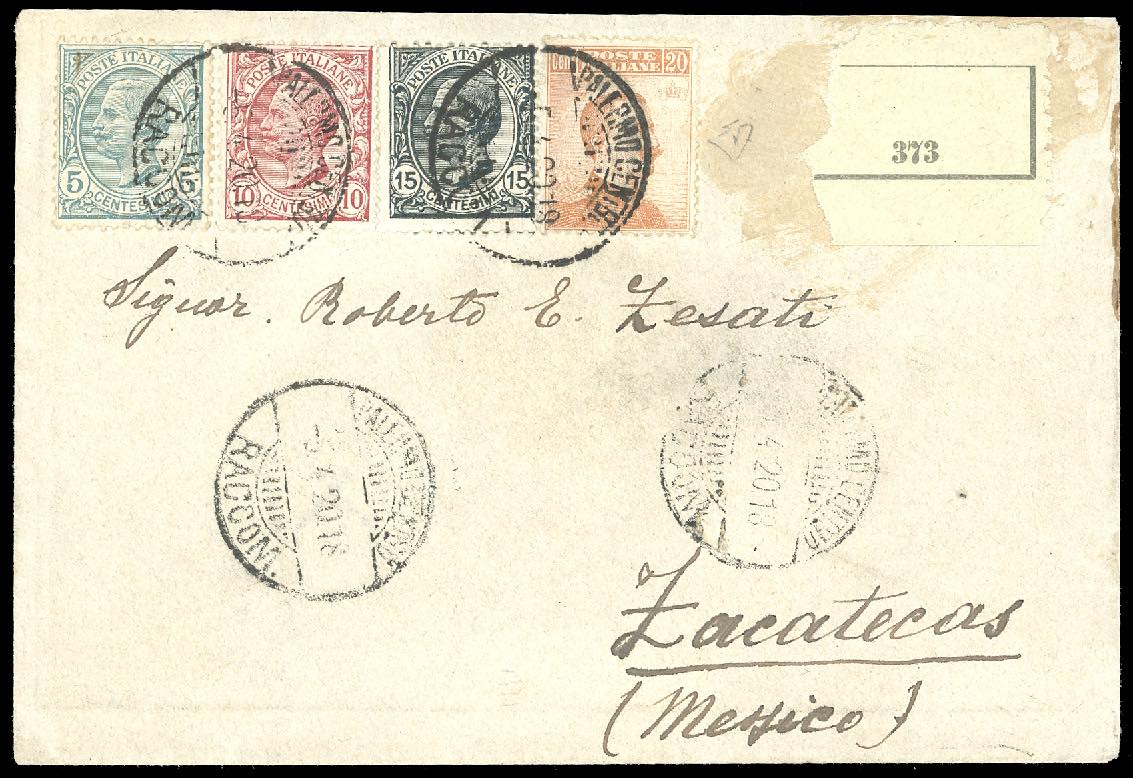 1920 - 5 cent., 10 cent. e 15 cent. Leoni, 20 cent. Michetti (81/82,108,109), perfetti, su busta raccomandata da Palermo 5/4/1920 per il Messico, bollo d'arrivo al verso. Pregevole destinazione. E.Diena.