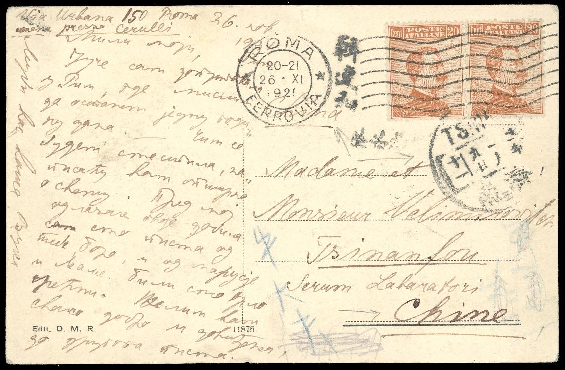 1921 - 20 cent. Michetti (109), coppia orizzontale, perfetta, su cartolina da Roma 26/11/1921 per la Cina, bollo d'arrivo. Rara ed affascinante destinazione.