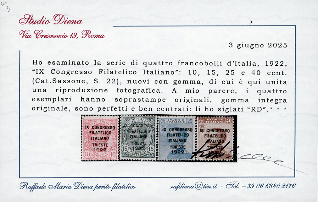 1922 - Congresso Filatelico, serie completa (123/126), ben centrati, nuovi, gomma originale integra, perfetti. A.Diena. (cat.Sassone € 4.500/13.500). Cert. Ferrario e Diena.