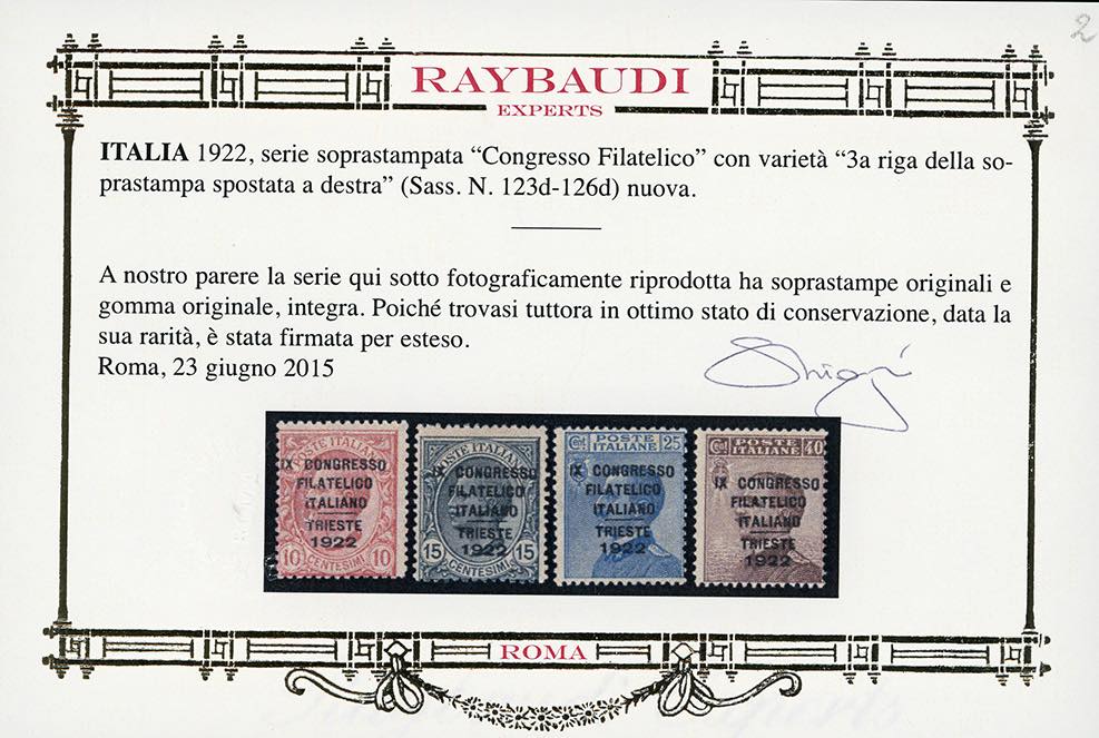 1922 - Congresso Filatelico, terza riga della soprastampa spostata a destra, serie completa (123d/126d), nuovi, gomma originale integra, perfetti e rari. Tre cert. E.Diena, cert. Oro Raybaudi per la serie.