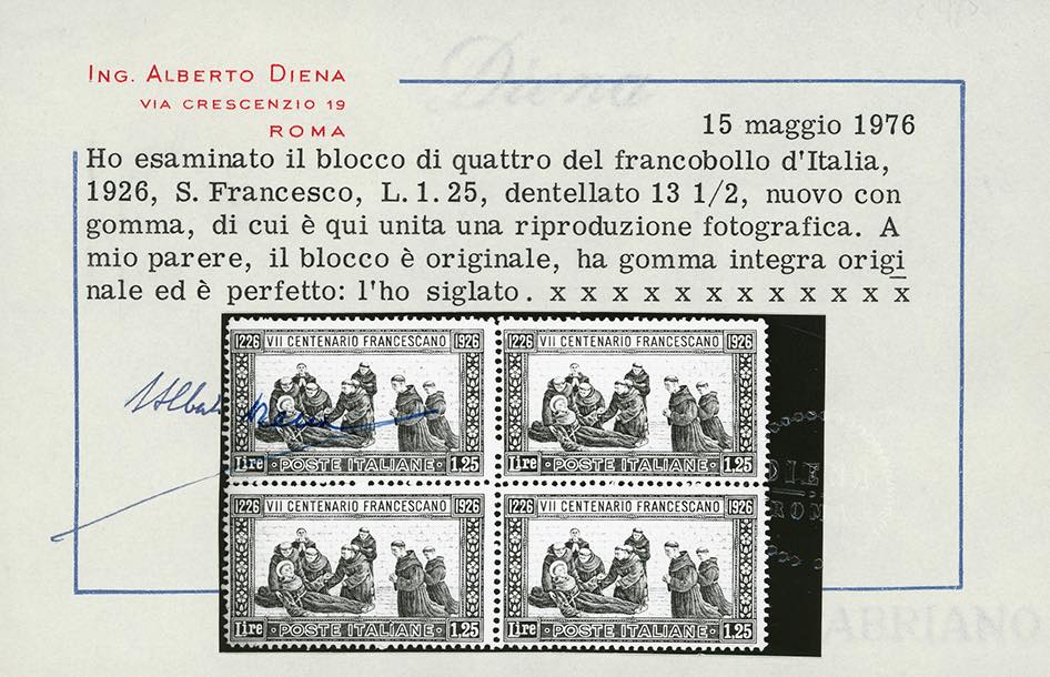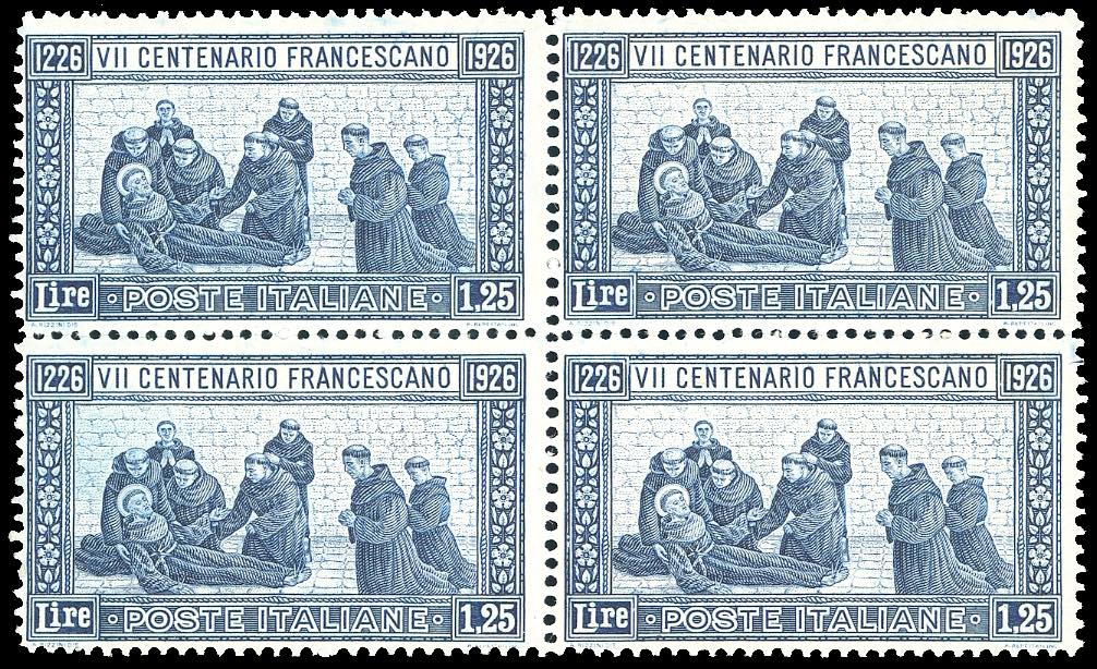 1926 - 1,25 lire San Francesco, dent. 13 1/2 (196), blocco di quattro, nuovo, gomma originale integra, perfetto e molto fresco. Cert. ... Read more