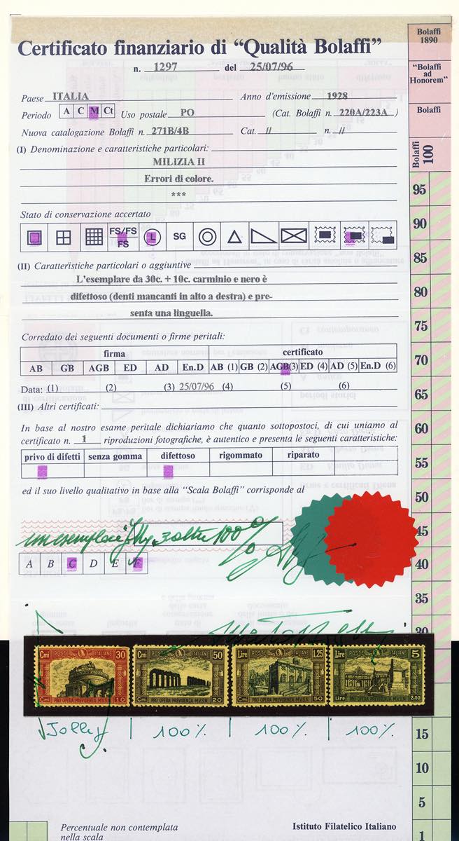 1928 - Milizia, II emissione, ERRORE DI COLORE, serie completa (220A/233A), gomma originale integra, perfetti, ad eccezione del francobollo da 30 + 10 cent. difettoso in un angolo. Tiratura 50 serie complete. Rarità di tutto il Regno d'Italia. Cert. Finanziario Bolaffi 100% per i tre valori perfetti, qualità "jolly" per quello difettoso.
