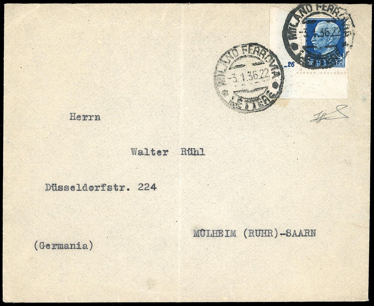 1936 - 1,25 lire Imperiale (253), angolo di foglio con numero di cilindro, perfetto, su lettera da Milano 3/1/1936 per la Germania. ... Read more