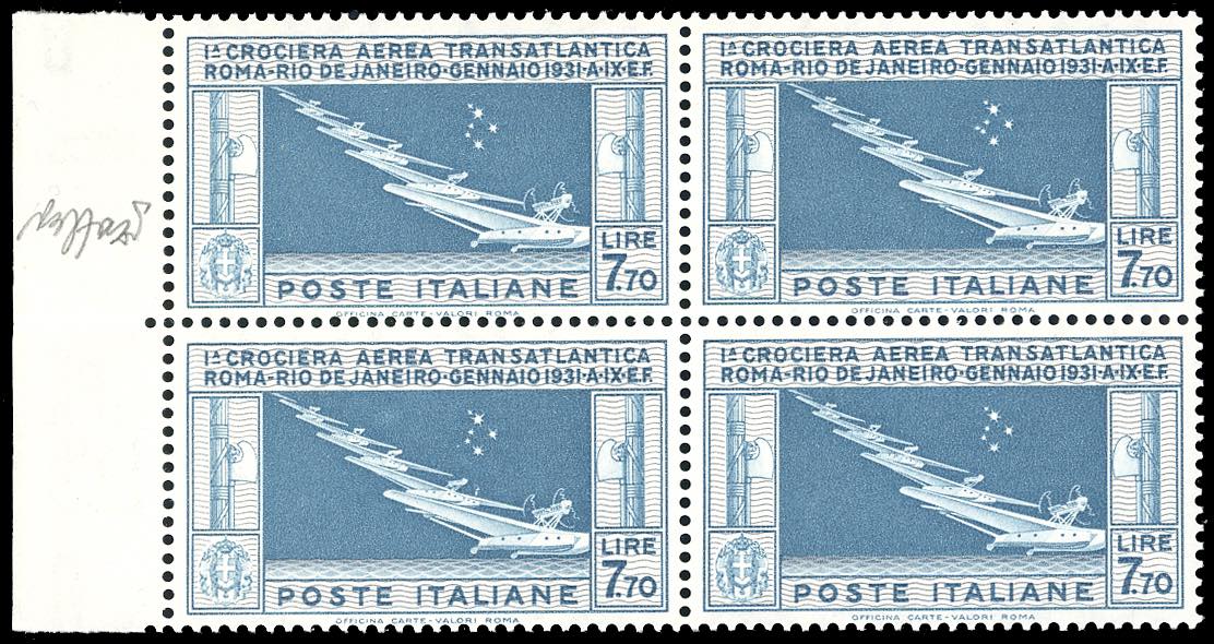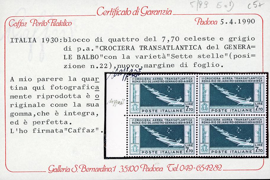 1930 - 7,70 lire Crociera Balbo, blocco di quattro, un esemplare con varietà "sette stelle" (25a,25), bordo di foglio, nuovo, gomma originale integra, perfetto. G.Bolaffi, cert. Caffaz.