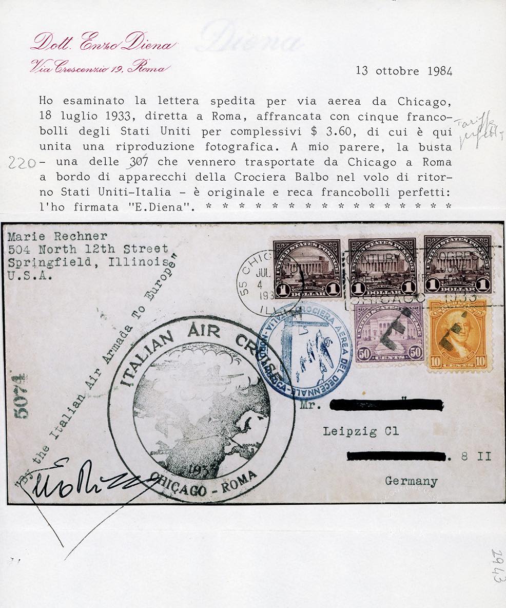 CROCIERA BALBO, TAPPA CHICAGO-ROMA 1933 - Aerogramma affrancato con cinque francobolli degli Stati Uniti d'America per complessivi 3,60 $, in perfetta tariffa, da Chicago per la Germania, trasportato fino a Roma a bordo degli apparecchi della Crociera Nord Atlantica del Generale Balbo nel Volo di Ritorno in Italia, bolli speciali sul fronte e al verso. Raro e di ottima qualità. 220 aerogrammi trasportati. Cert. E.Diena.