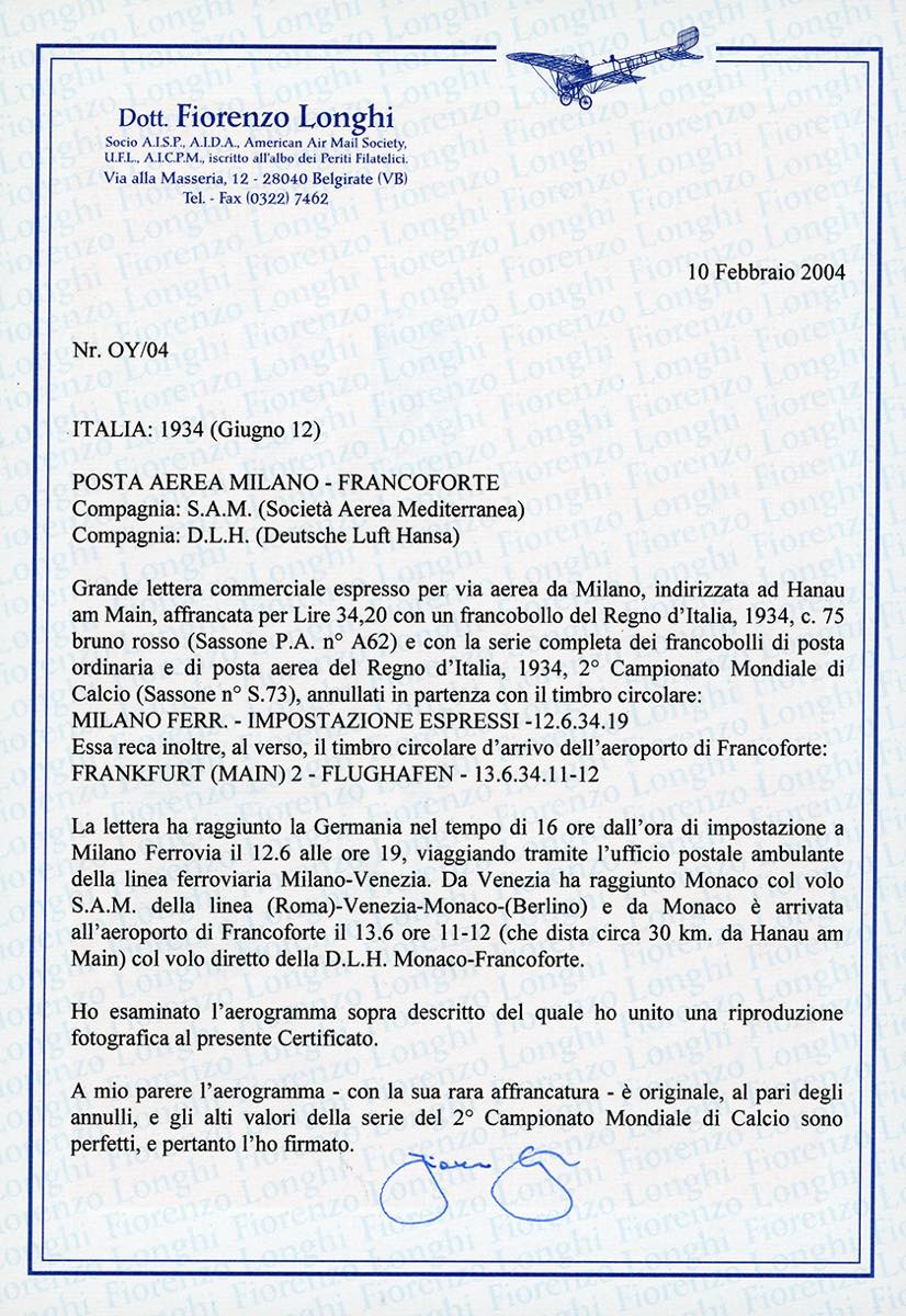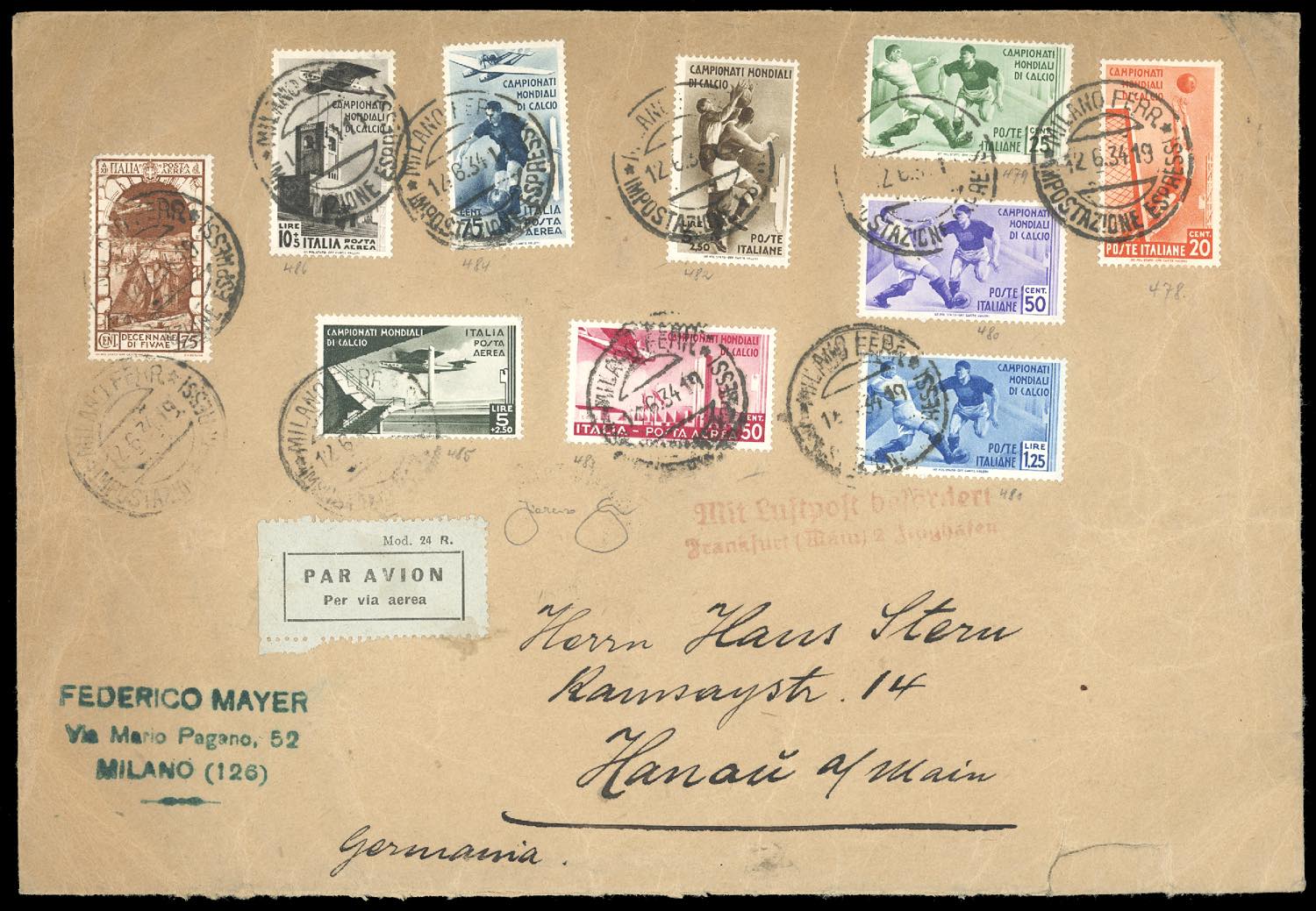 1934 - Mondiali di calcio, serie completa di posta aerea e di posta ordinaria, con complementare (A69/A72,357/361,A62), gli alti valori perfetti, qualche difetto sui bassi valori, su aerogramma da Milano 12/6/1934 per la Germania, volato con volo S.A.M. Venezia a Monaco, con volo D.L.H. da Monaco a Francoforte. Raro insieme. Dettagliato cert. Longhi.