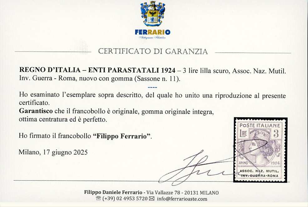 ASSOC.NAZ.MUTIL.INV.GUERRA-ROMA 1924 -3 lire lilla scuro (11), nuovo, gomma originale integra, perfetto. Ottima centratura. Bellissimo. A.Diena, cert. Ferrario.