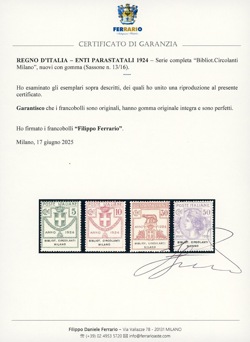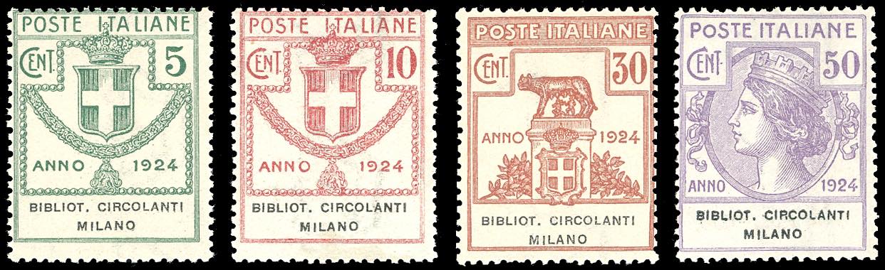 BIBLIOT.CIRCOLANTI MILANO 1924 - Serie completa (13/16), nuovi, gomma originale integra, perfetti. Molto freschi. Cert. Ferrario.