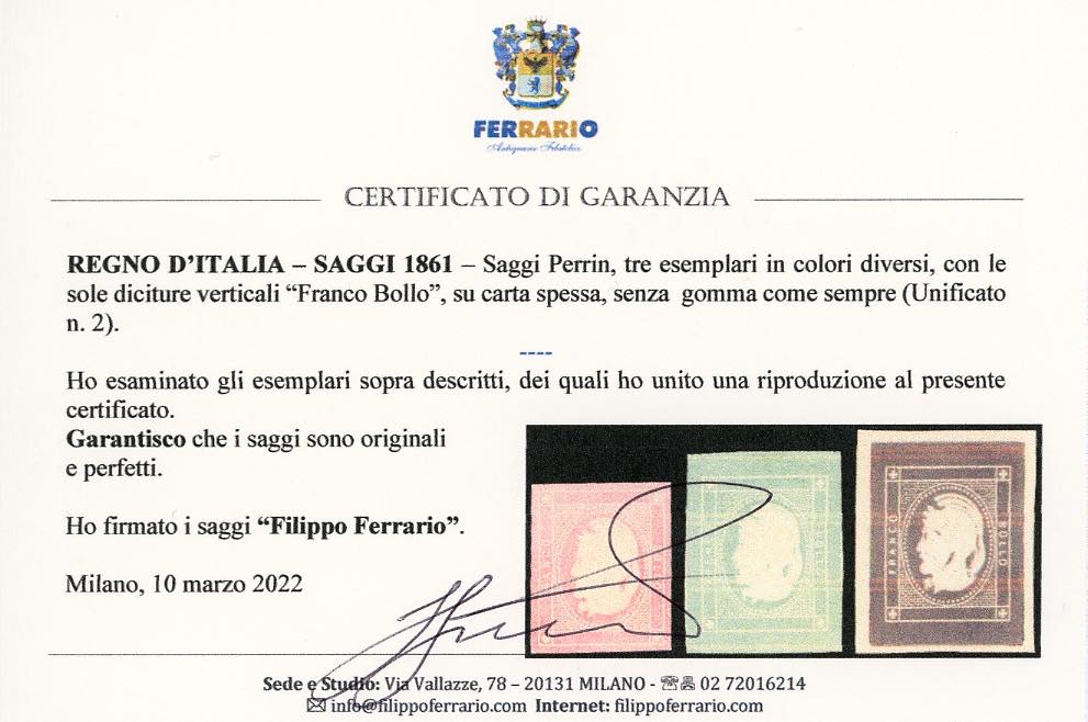 1861 - Saggi Perrin, tre esemplari di colori diversi solo con le diciture verticali su carta spessa (Unificato 2), senza gomma come sempre, perfetti. Rari. Cert. Ferrario.