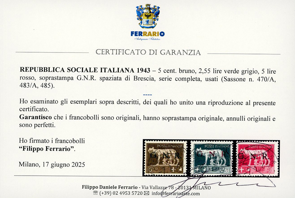 1943 - Soprastampa G.N.R. di Brescia del I tipo spaziata, serie completa (470/A+483/A,485), usati, perfetti. Molto rari. G.Oliva, Raybaudi. Cert. Ferrario.