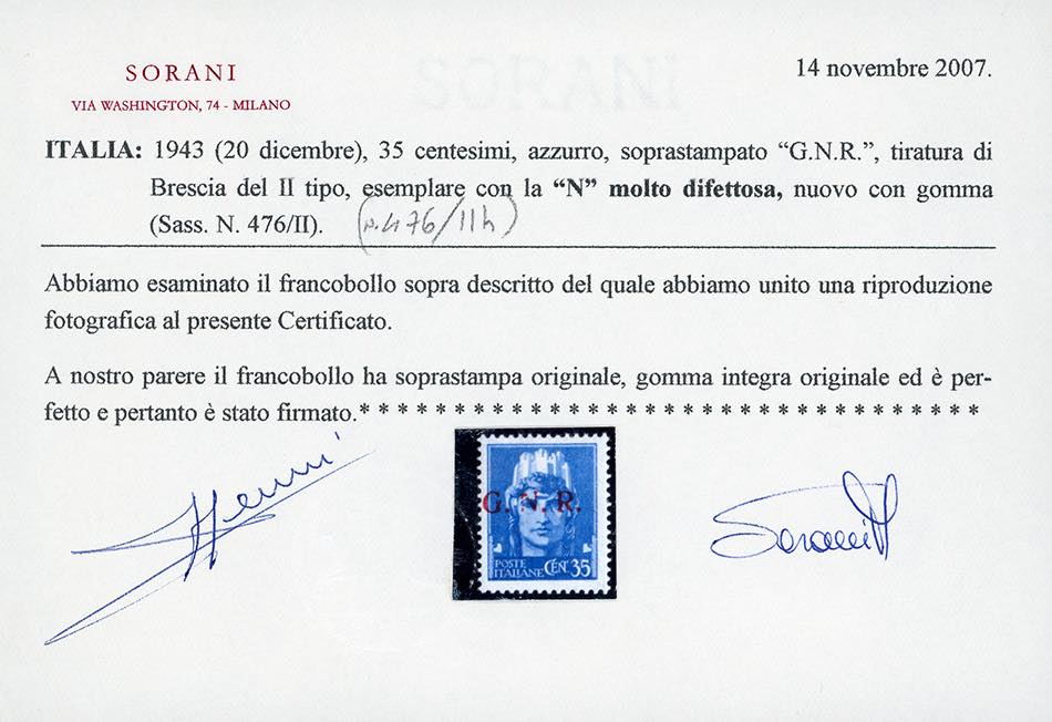 1943 - 35 cent., soprastampa G.N.R. di Brescia, II tipo, varietà "N" incompleta e molto difettosa (476/II), nuovo, gomma originale integra, perfetto. Varietà molto rara, non catalogata per questo valore. Ferrario, cert. Sorani.