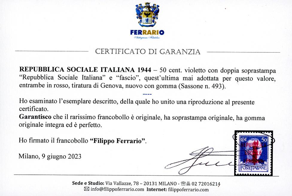 1944 - 50 cent. doppia soprastampa di Genova, non adottata, l'altra con fascio rosso scambio di soprastampa (493), nuovo, gomma originale integra, perfetto. Splendido ed estremamente raro, finora non catalogato. Pochi esistenti. Cert. Ferrario.