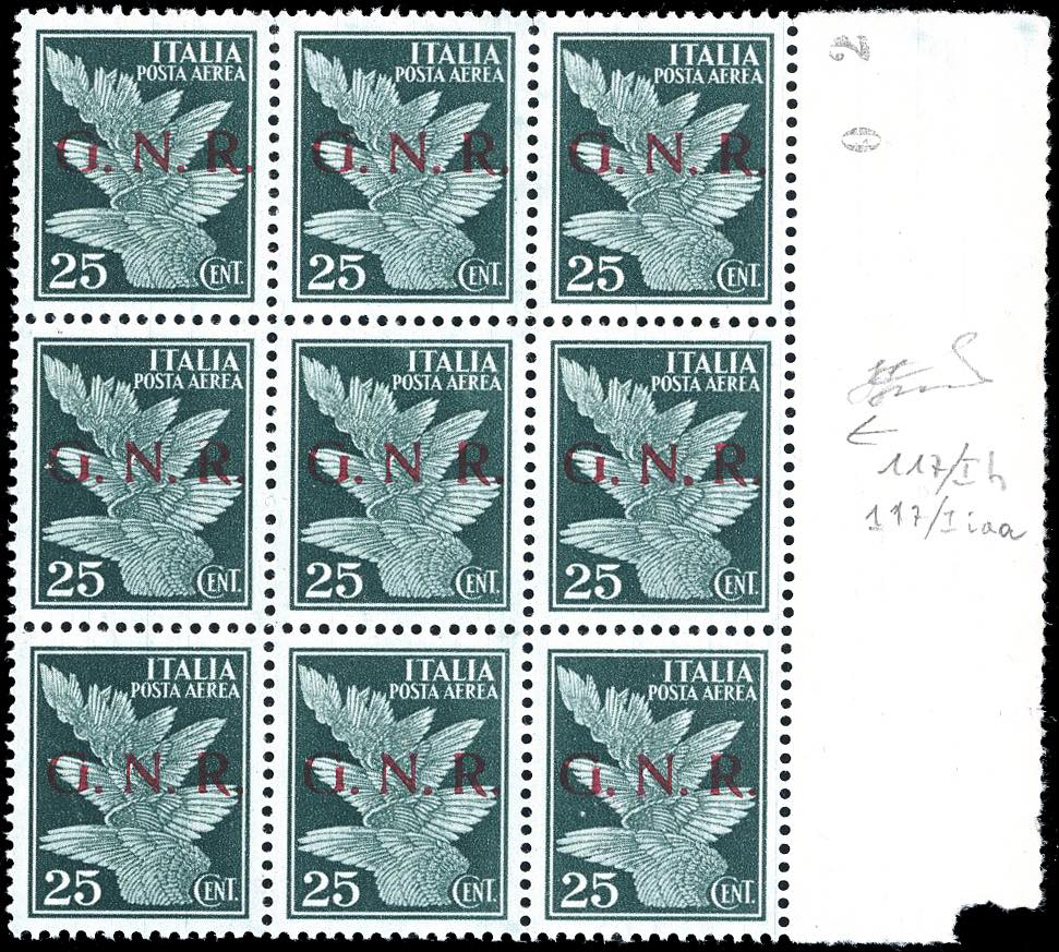 1943 - 25 cent. soprastampa G.N.R. di Brescia, I tipo, II tiratura, blocco di nove esemplari con al centro le posizioni 68-70, il primo esemplare con la "R" scalpellata, non catalogato, il secondo senza punto dopo la "N", il terzo con punto grosso dopo la "N" (117/I,117/Ih,117/Iiaa), bordo di foglio, nuovo, gomma originale integra, perfetto e molto fresco. Ferrario.