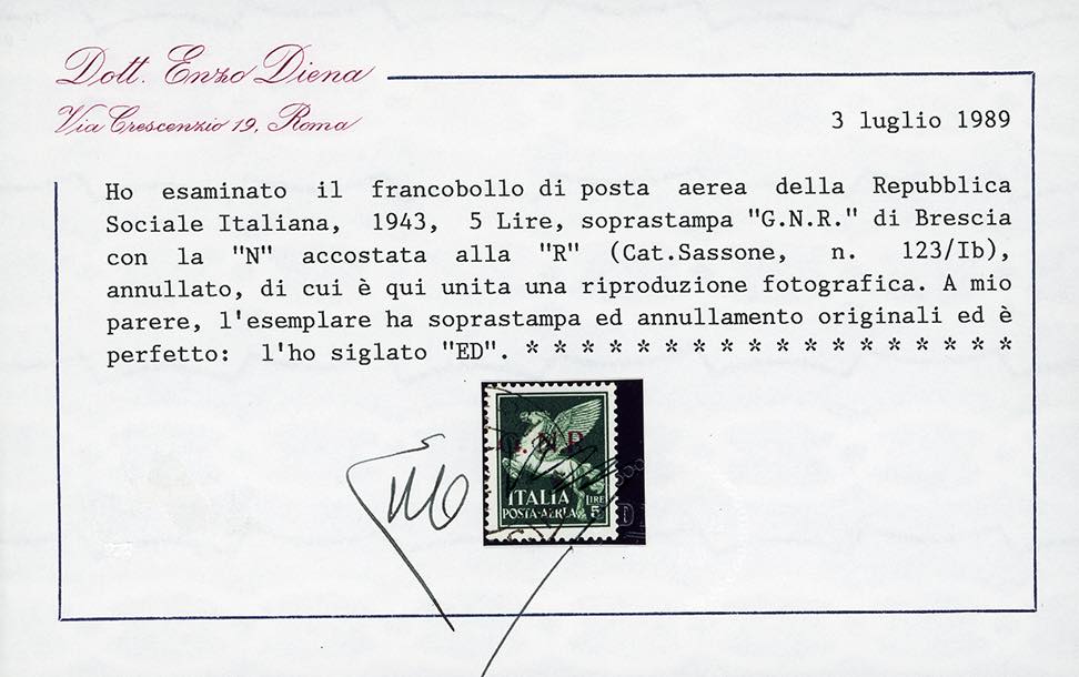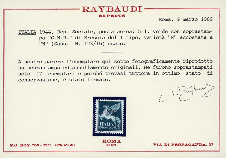 1943 - 5 lire, soprastampa G.N.R. di Brescia, I tipo, varietà "R" accostata a "N" (123/If), usato, perfetto. Molto raro, tiratura 17 ... Read more