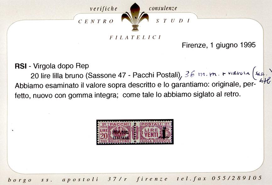 1944 - 20 lire, soprastampa di 36 mm. e varietà virgola anziché punto dopo "REP" (47b nota), nuovo, gomma originale integra, perfetto. Molto raro. E.Diena, Ferrario.