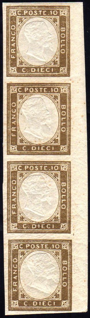 1861 - 10 cent. terra d'ombra, non emesso, striscia verticale di quattro con margine destro di foglio non tosato (2), gomma integra, ... Read more