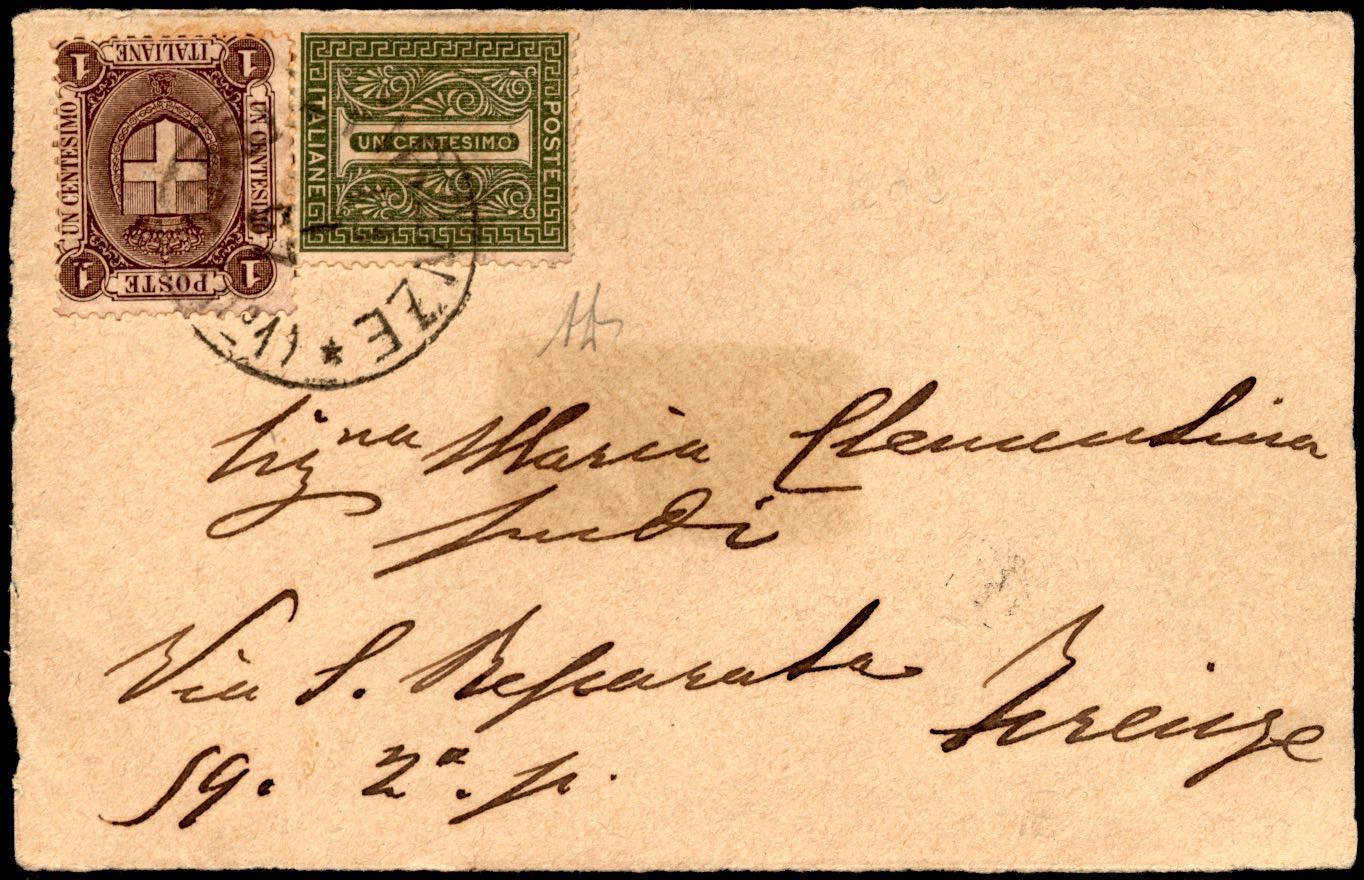 1901 - 1 cent. De La Rue, tiratura di Torino (T14) e 1 cent. Umberto (65), perfetti, su frontespizio di lettera da Firenze 25/1/1901 per ... Read more