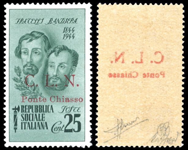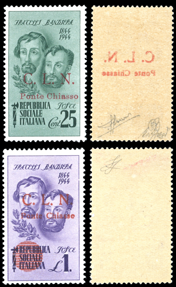 PONTE CHIASSO 1945 - 1 lira Bandiera, decalco della soprastampa e 25 cent., soprastampati (11,12b), nuovi, gomma integra, perfetti. ... Read more