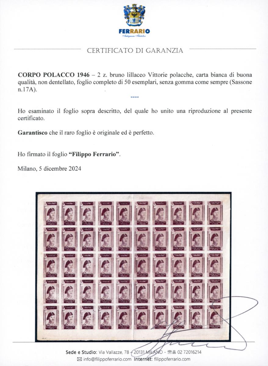 1946 - 2 z. bruno lillaceo Vittorie polacche, non dentellato (17A), foglio completo di 50 esemplari, senza gomma come sempre, perfetto. Raro. Cert. Ferrario.