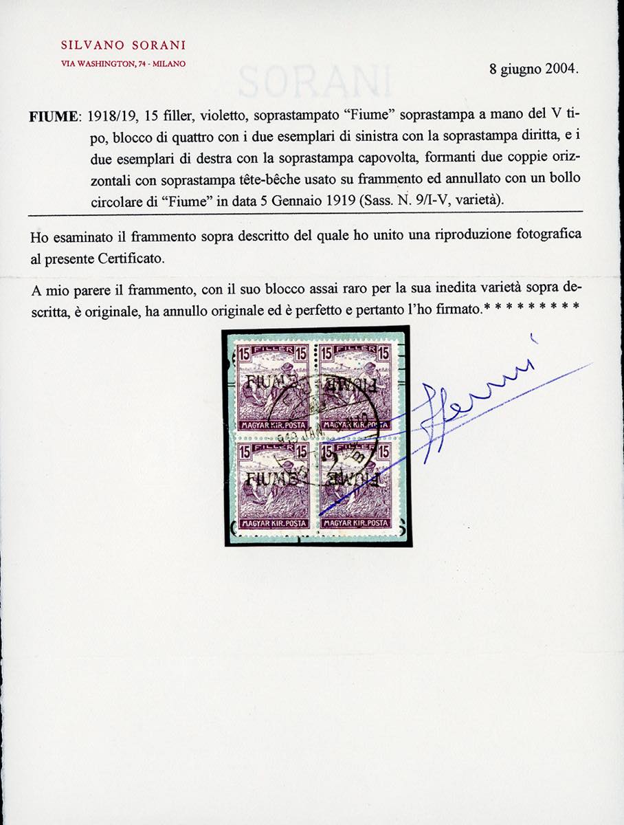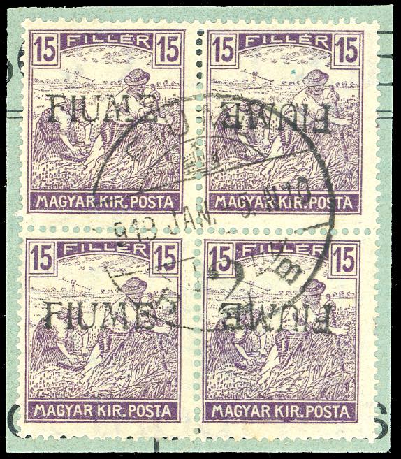 FIUME 1918 - 15 f. Mietitori, soprastampa a mano del V tipo, blocco di quattro, i due esemplari di sinistra con la soprastampa dritta, i due di destra con la soprastampa capovolta (9/Vab), perfetto, usato su frammento a Fiume 5/1/1919. UNICO NOTO, grande rarità dell'emissione. Cert. Sorani.