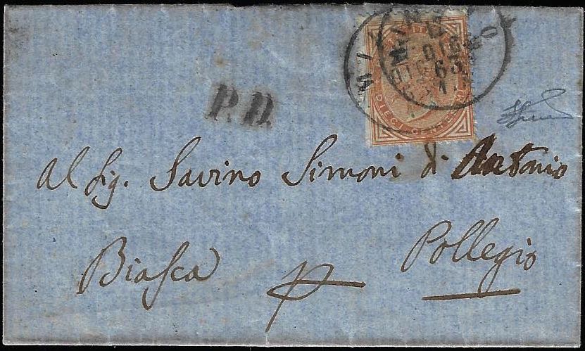 1863 - 10 cent. De La Rue, tiratura di Londra (L17), tagliato con le forbici, isolato su lettera da Milano 12/12/1863 a Biasca, in Svizzera. Rara lettera in tariffa di raggio limitrofo del dicembre 1863. Ferrario.