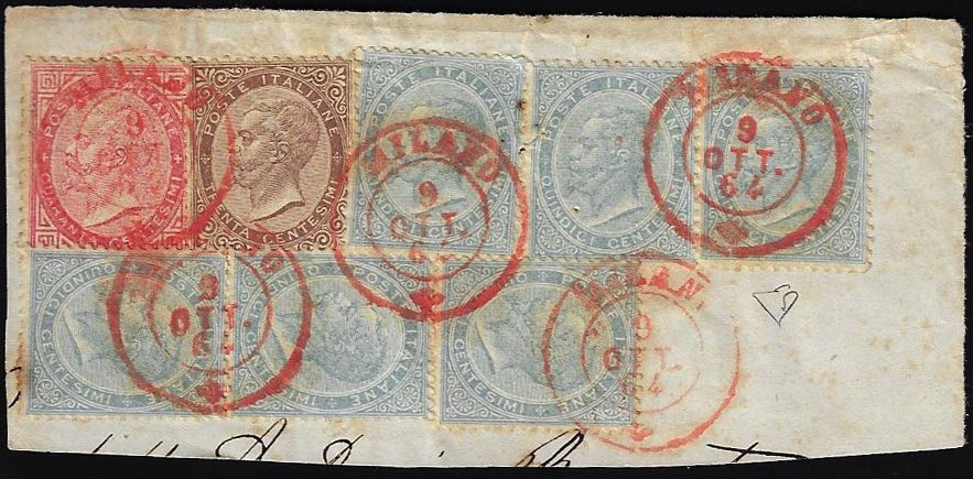 1863 - 15 cent., sei esemplari, 30 cent., 40 cent. De La Rue, tiratura di Londra (L18/L20), ottimo stato, usati su frammento a Milano 9/10/1864, annullo rosso. D'effetto. E.Diena.
