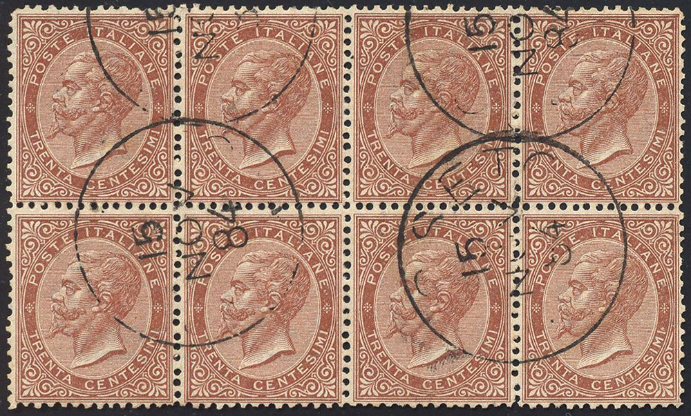 1863 - 30 cent. De La Rue, tiratura di Torino (T19), blocco di otto esemplari usati, perfetto. Raro. Emilio ed A. Diena, cert. Raybaudi.