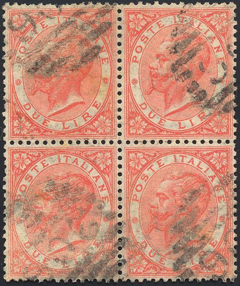 1863 - 2 lire De La Rue, tiratura di Torino (T22), blocco di quattro esemplari usati, perfetto. Raro! Cert. Diena.
