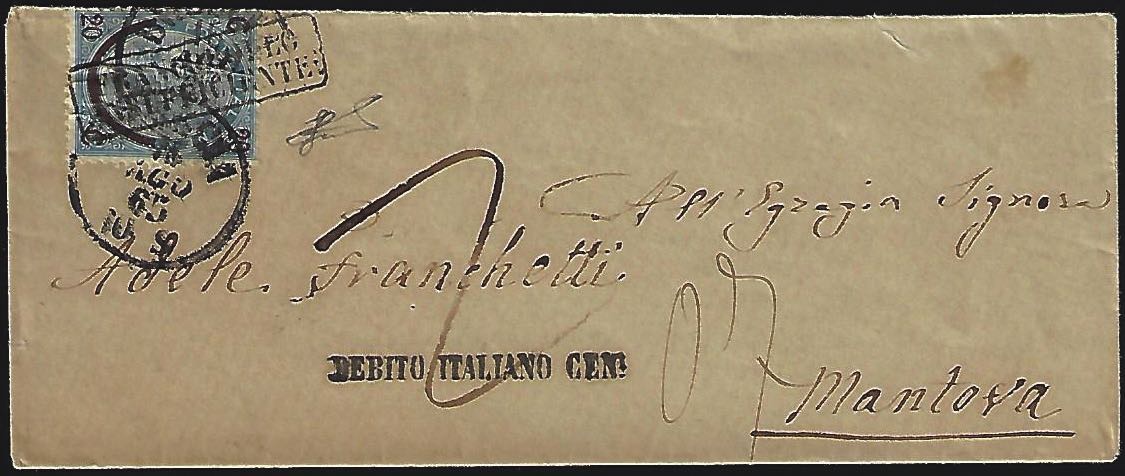 1865 - 20 cent. su 15 cent. Ferro di cavallo, I tipo (23), grinze d'applicazione, su bustine da Brescia 16/8/1865 a Mantova, tassata. Interessante per il bollo "FRANCOBOLLI INSUFFICIENTE" in cartella, coannullatore. Ferrario.