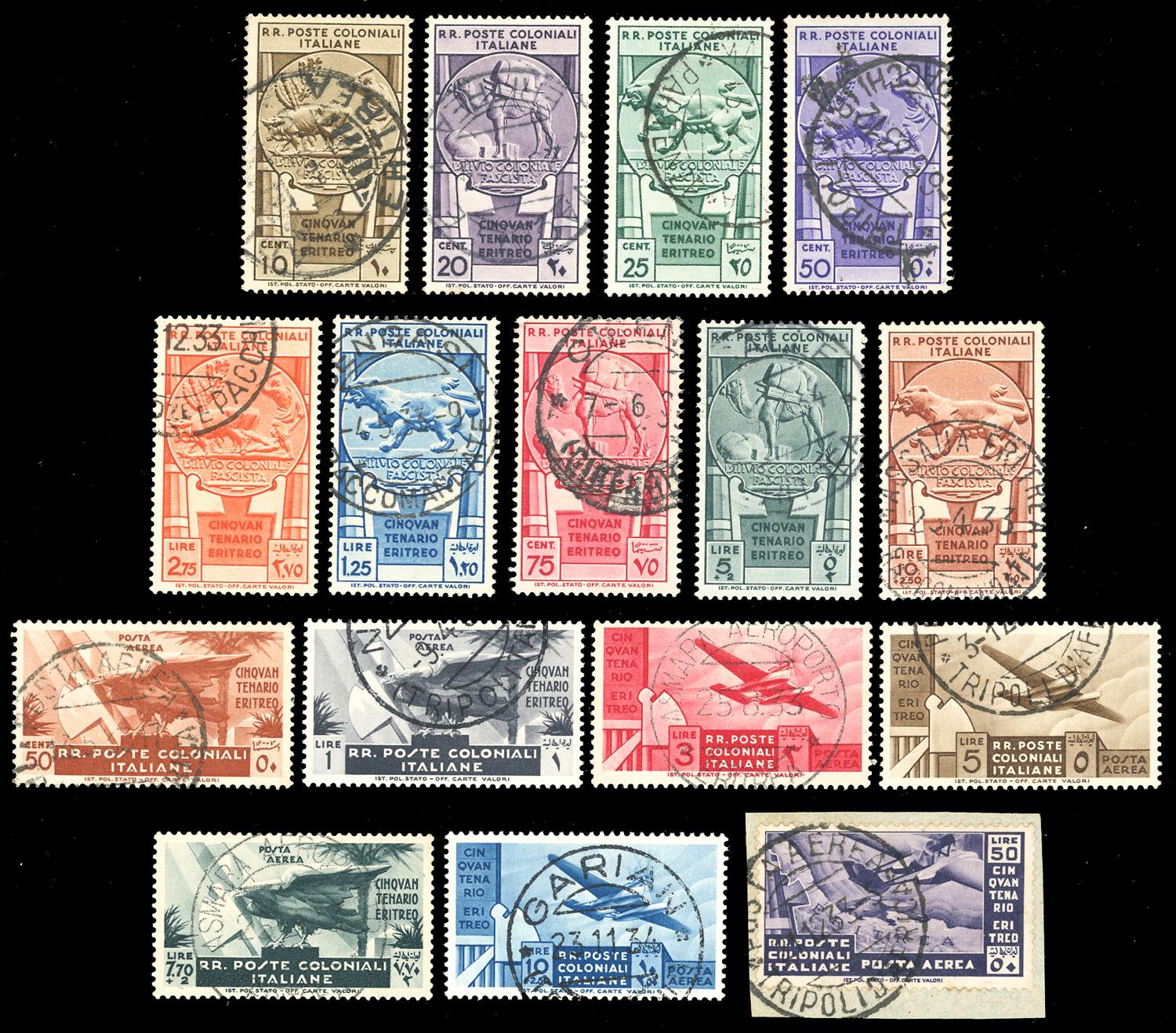 1933 - Cinquantenario Eritreo, serie completa (23/31+A), perfetti, usati con annullo originale. Raybaudi per i n. 31 e A19, Ferrario per la ... Read more