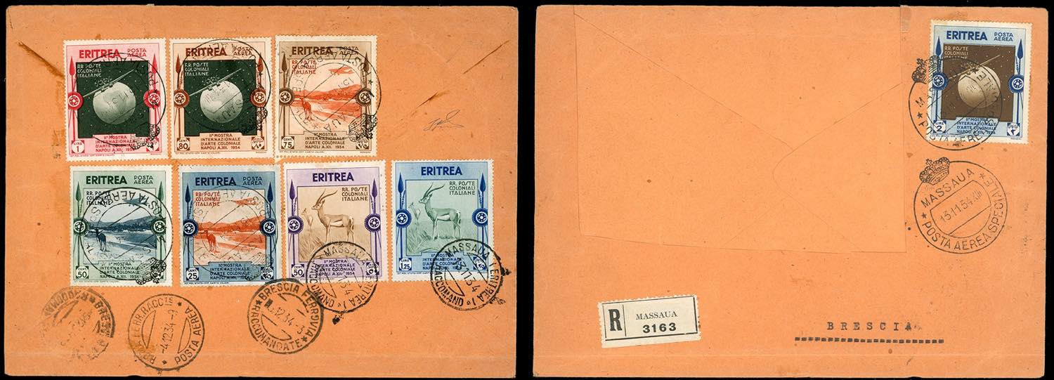 POSTA AEREA 1934 - Arte coloniale, serie completa, insieme a 50 cent. e 1,25 lire di posta ordinaria (A1/A6,223,225), in affrancatura recto/verso su aerogramma raccomandato, in parte ritagliato sul fronte, da Massaua 13/11/1934, bollo speciale del volo Roma-Mogadiscio, a Brescia. Ferrario.