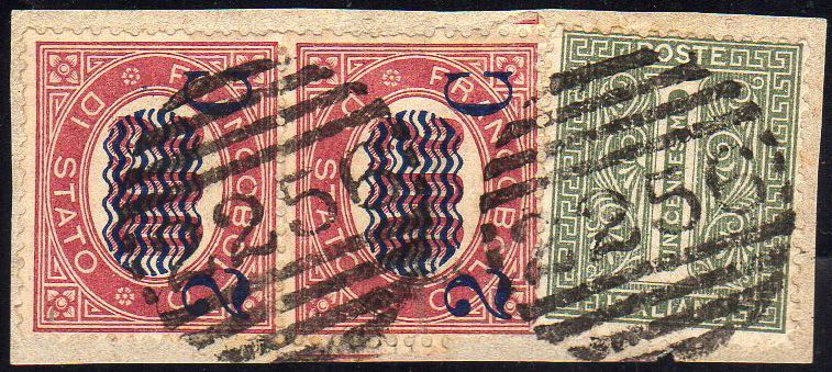 1878 - 2 cent. su 2 lire Servizio soprastampati, due esemplari SOPRASTAMPA CAPOVOLTA e 1 cent. De La Rue, tiratura di Torino (34b, T14), usati su frammento con il numerale a sbarre 2256 di Spilimbergo. Insieme molto raro! Giulio Bolaffi, Em. e A.Diena, cert. Diena.