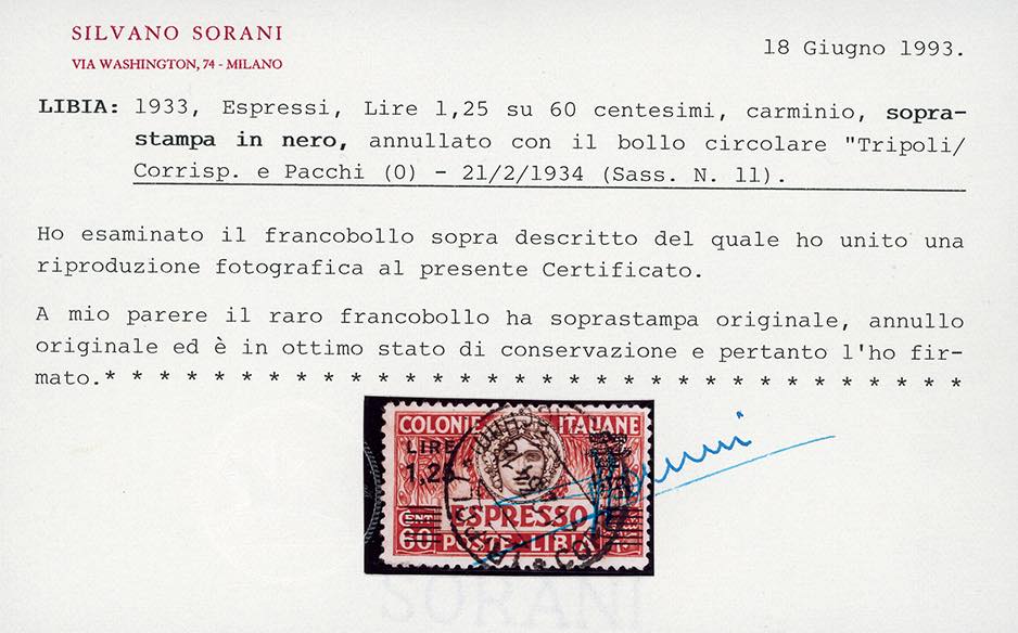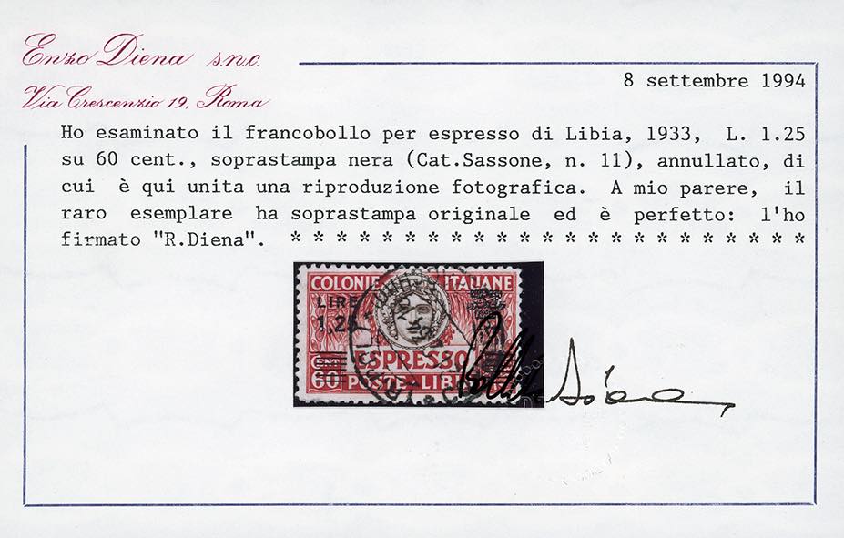 ESPRESSI 1933 - 1,25 lire su 60 cent., dent. 11, soprastampa in nero (11), usato, perfetto. Molto raro. G.Oliva, Enzo Diena, Ferrario, ... Read more