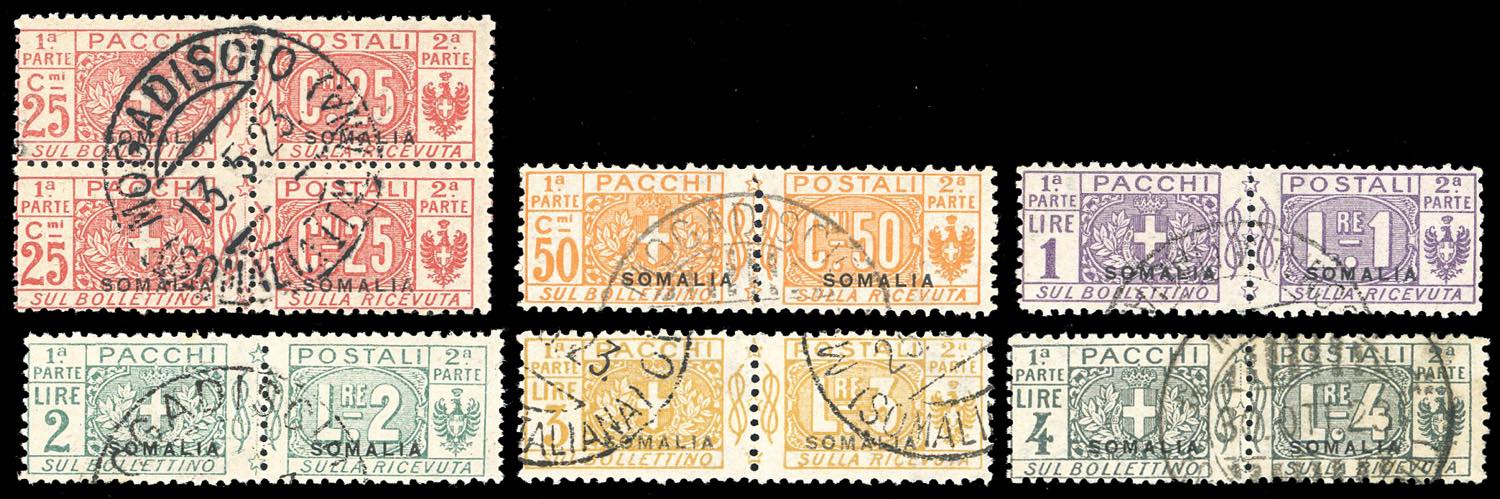 PACCHI POSTALI 1923 - Nodo di Sicilia, soprastampa "Somalia", serie completa (15/20), coppia per il 25 cent., perfetti, usati con annulli ... Read more