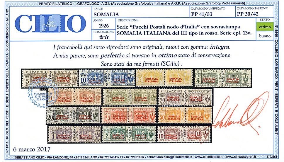PACCHI POSTALI 1926 - Soprastampati in rosso, III tipo, serie completa (30/42), gomma originale integra, perfetti. Cert. Cilio.