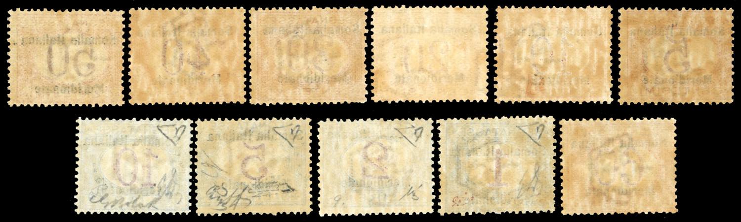 SEGNATASSE 1906 - Soprastampati "Somalia Italiana Meridionale", serie completa (1/11), nuovi, gomma originale integra, perfetti. Molto freschi. Alti valori cert. Enzo Diena.