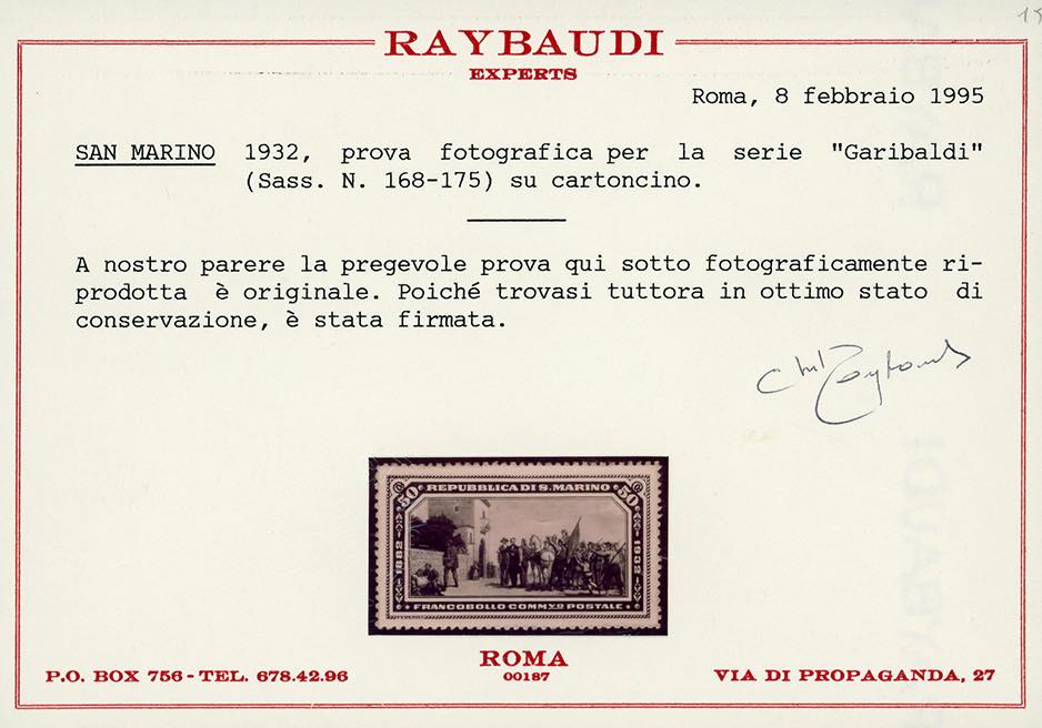 1932 - 50 cent. Garibaldi (171), prova fotografica di E.Federici in nero, dentellata, applicata su cartoncino nero, con soggetto non ... Read more