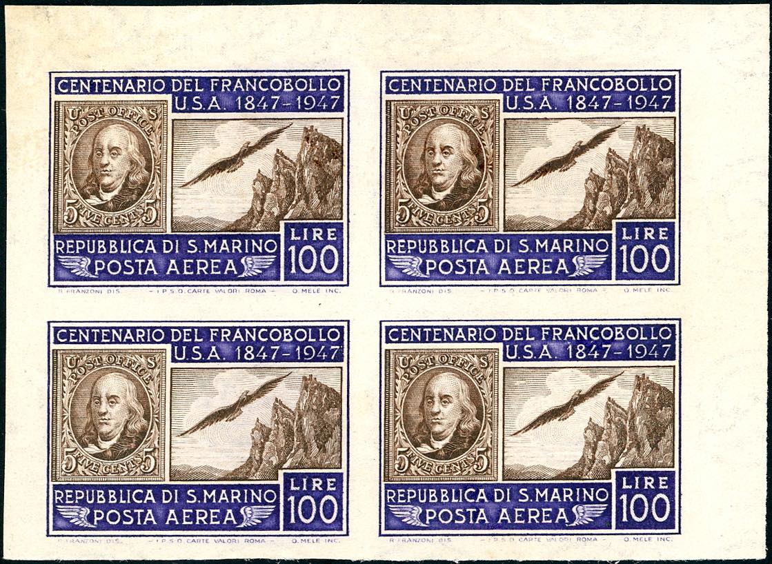 1947 - 100 lire Centenario francobollo Stati Uniti, non dentellato (75b), blocco di quattro, angolo di foglio, gomma integra, leggermente ... Read more