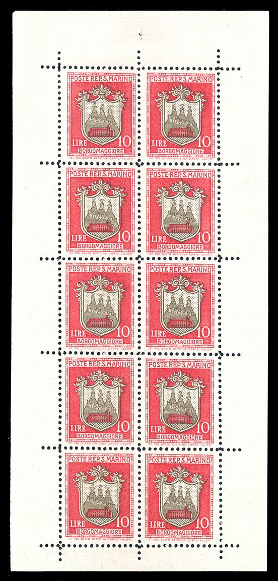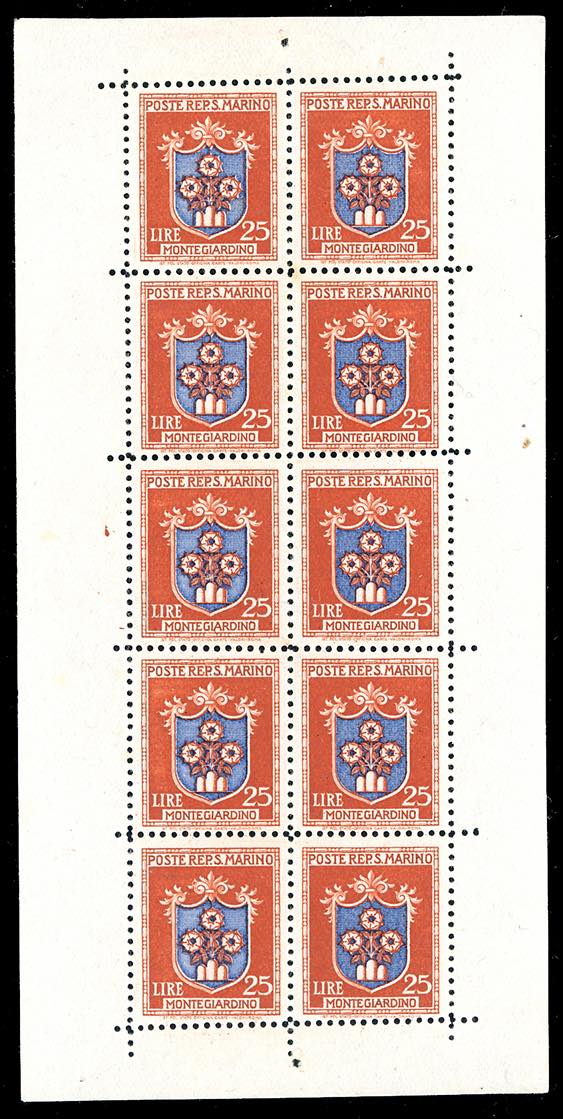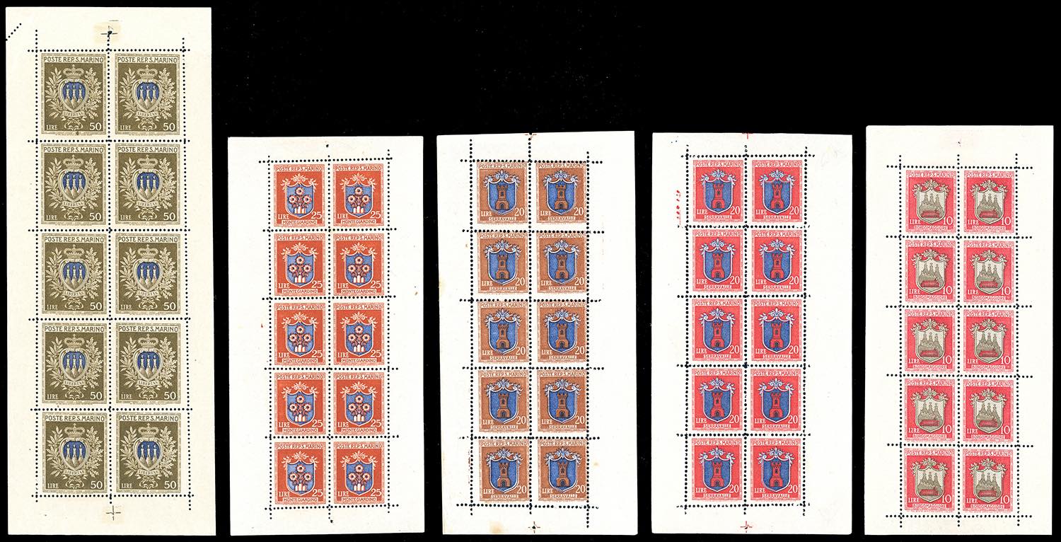 1945/46 - Stemmi, minifogli, serie completa (1/5), nuovi, gomma originale integra, perfetti e di ottima qualità. Ferrario per l'alto valore, che presenta un'inedita dentellatura parziale obliqua sul bordo.