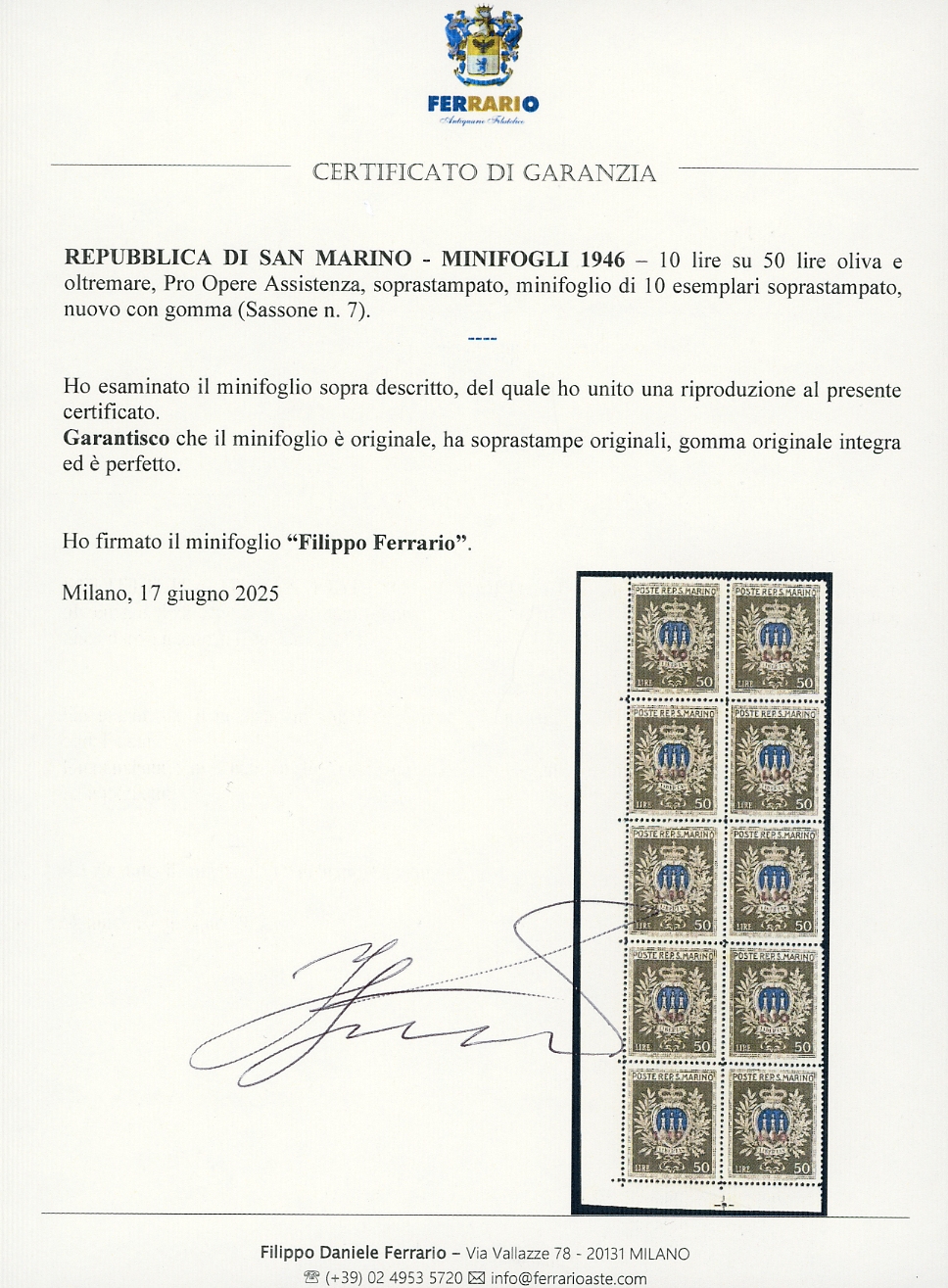 1946 - 10 lire su 50 lire Pro Opere Assistenza, minifoglio (7), nuovo, gomma originale integra, perfetto e di ottima qualità. Cert. Ferrario.