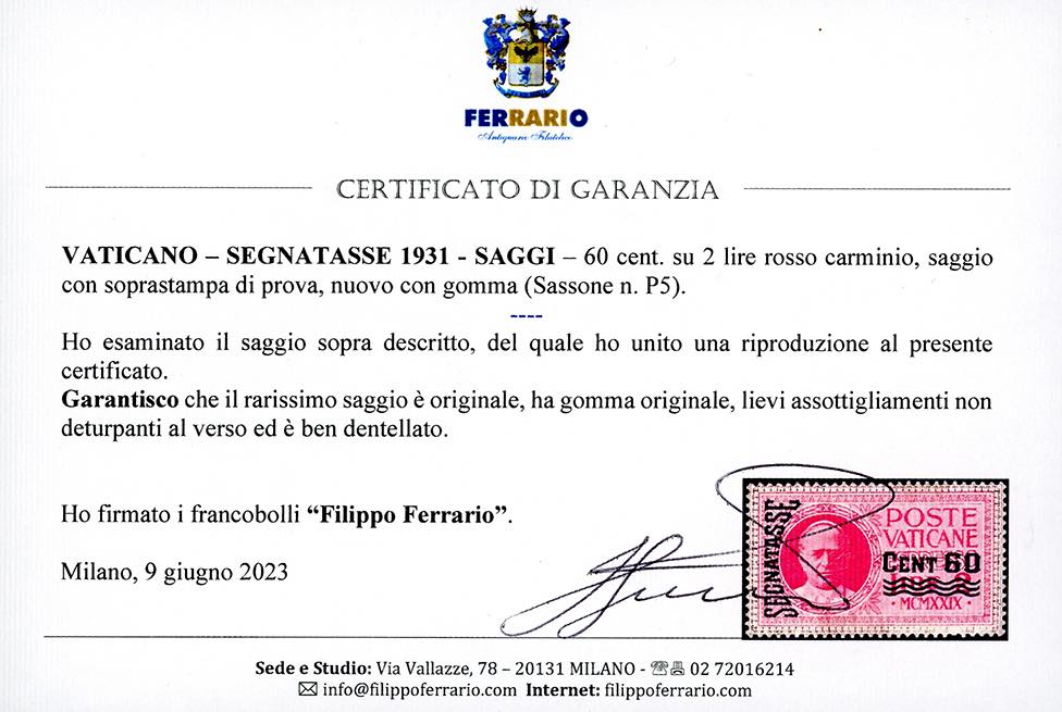 1931 - 60 cent. su 2 lire rosso carminio, SOPRASTAMPA DI PROVA (P5), nuovo, gomma originale, lievi assottigliamenti non deturpanti al ... Read more