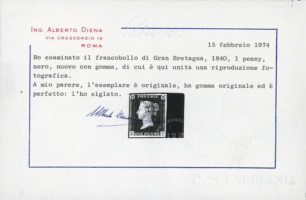 GRAN BRETAGNA 1840 - 1 p. Penny black (1), nuovo, gomma originale, perfetto. Molto fresco e ben marginato. Il primo francobollo emesso al mondo, in ottimo stato di conservazione. Cert. A.Diena ed Enzo Diena 1987.
