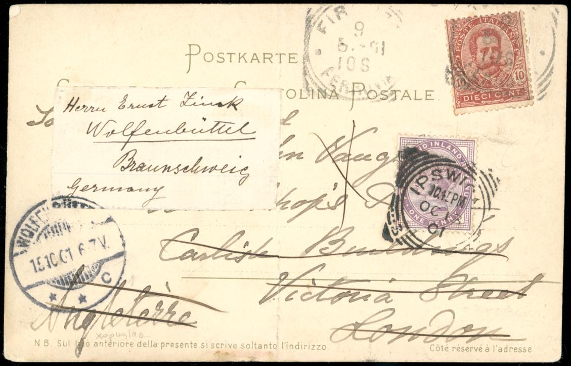 GRAN BRETAGNA/ITALIA/GERMANIA 1901 - Redirected with additional franking.