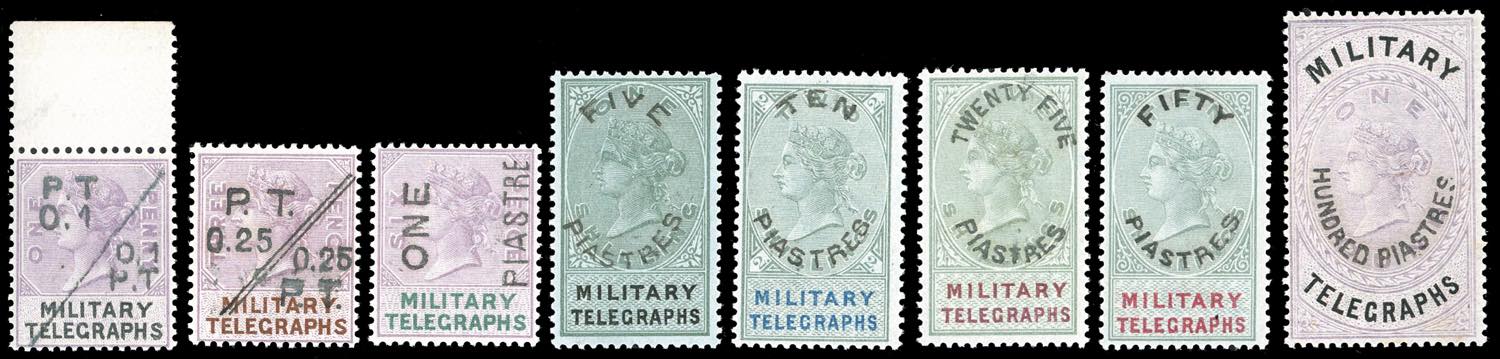 GRAN BRETAGNA TELEGRAFI MILITARI 1886 - Soprastampati in Egitto con valore in piastre, serie completa (Unif.13/20,S.G.MT9/16), nuovi, gomma originale integra per i primi sette valori (MNH), gomma originale, con linguella leggera per il n. 20. Perfetti e di bellissima qualità. Firmati A.Diena.