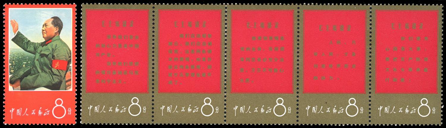 1967 - Thoughts of Mao Tse-Tung, 8 f. Mao and the first strip of five red and gold, slightly folded along the vertical perforation (Mi.966,967/971), full original gum, MNH, very fine, perfect conditions.