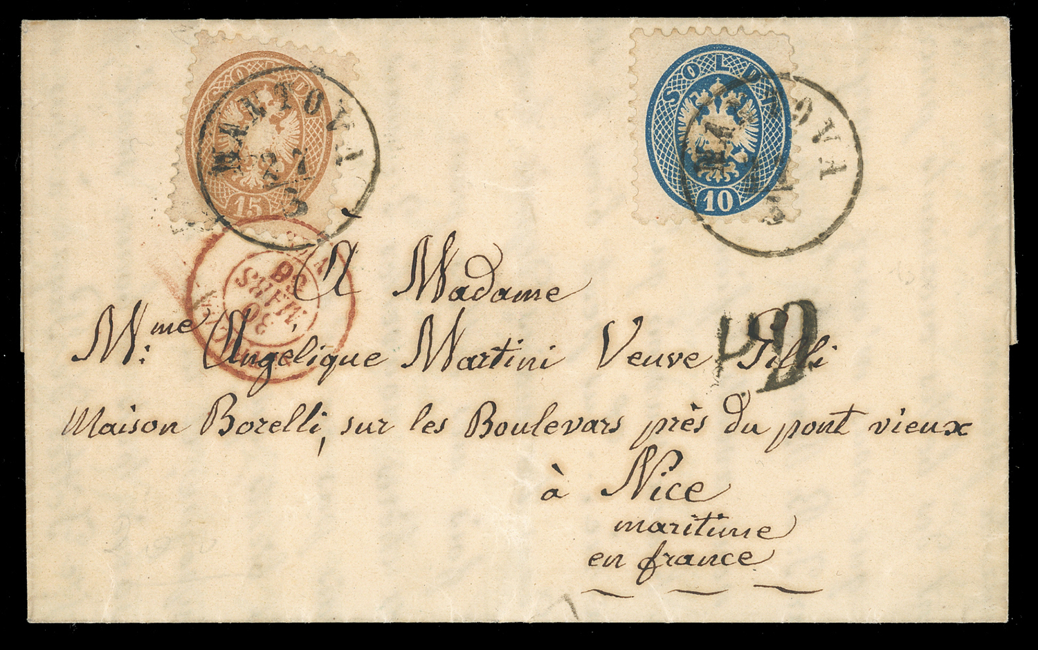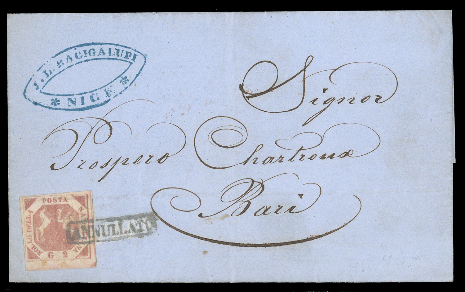SARDEGNA CONTEA DI NIZZA 1853/1869 - Insieme di undici lettere: incoming mail, tutte dirette a Nizza, spedite: dal Lombardo Veneto, dal Regno di Napoli, da Parma, dallo Stato Pontificio, dalla Sardegna, dall'Austria e dall'Inghilterra e una forwarding da Nizza a Bari e qui affrancata con 2 gr di Napoli Regno. Insieme molto interessante e di ottima qualità.