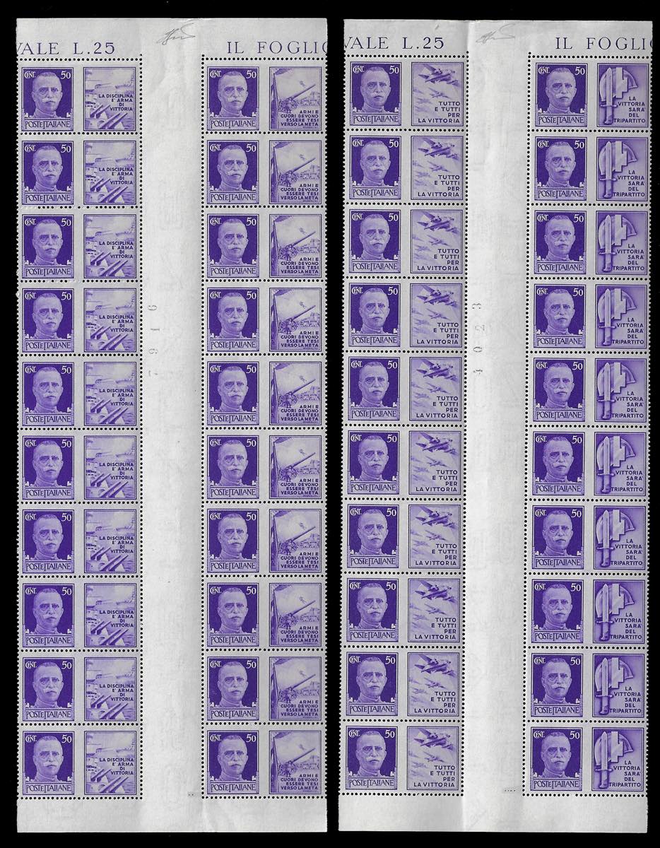 REGNO D'ITALIA PROPAGANDA DI GUERRA 1942 - Dieci serie complete (1/12), in blocchi di 20 con interspazio di gruppo al centro, non piegato. Non comuni, ottima qualità.